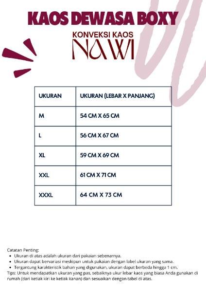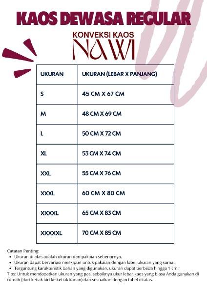 3. Berapa batas toleransi ukuran (size chart) di NAWI? Karena proses potong dan jahit dilakukan secara manual oleh tenaga manusia, terdapat toleransi ukuran sekitar 1-2 cm dari size chart yang kami sediakan.